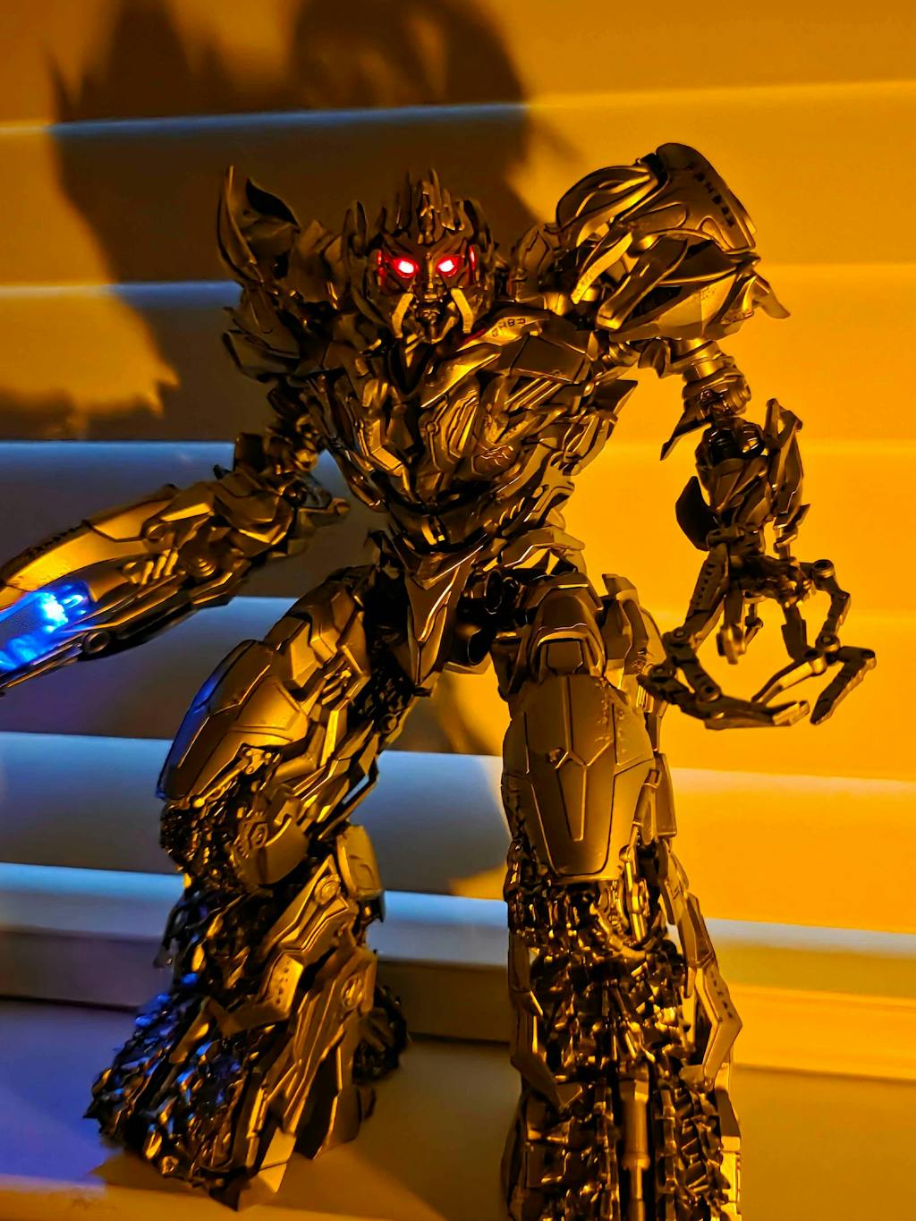 • LED Light-Up Feature – Equipped with magnet-activated LEDs, both Megatron’s eyes and fusion cannon light up with three selectable lighting modes—perfect for dynamic display options.
