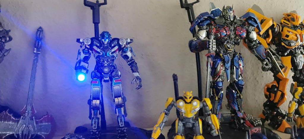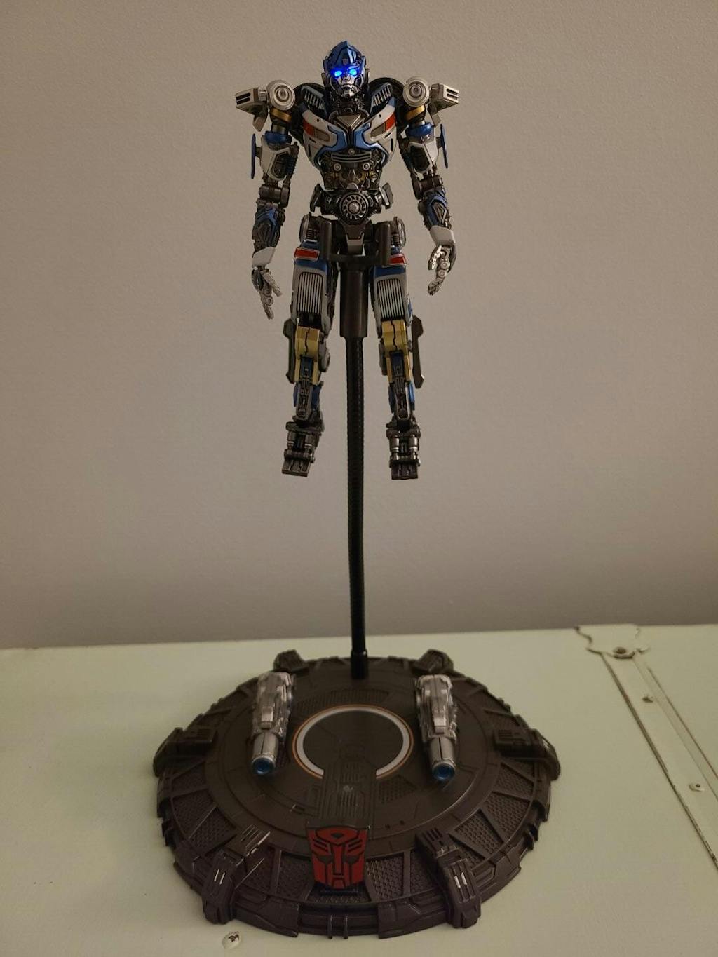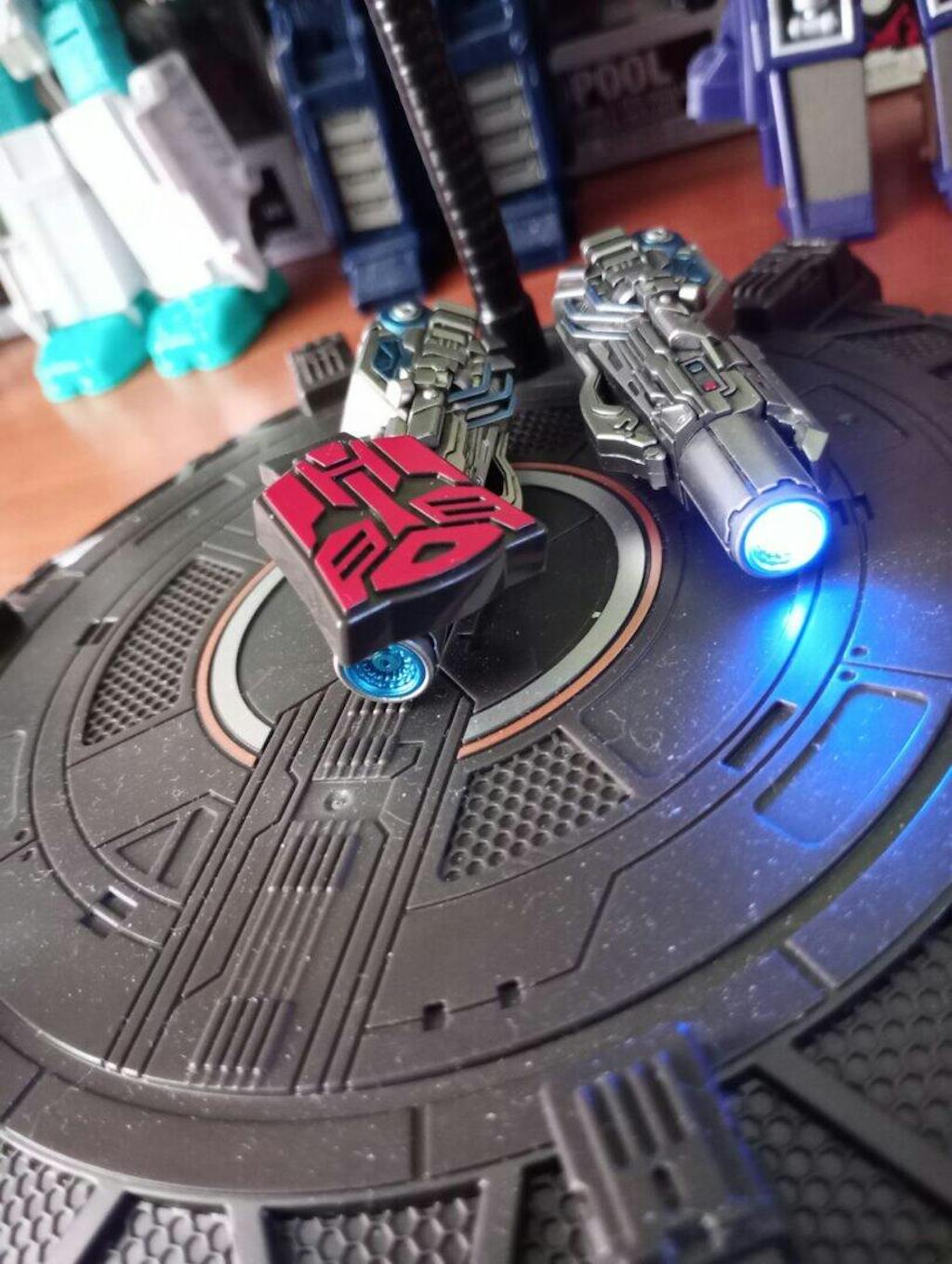 • LED Lighting Effects – The eyes and dual hand cannons feature magnetic, light-up systems for dynamic display options, powered by an Autobot logo embedded in the Energon base that acts as the light switch.