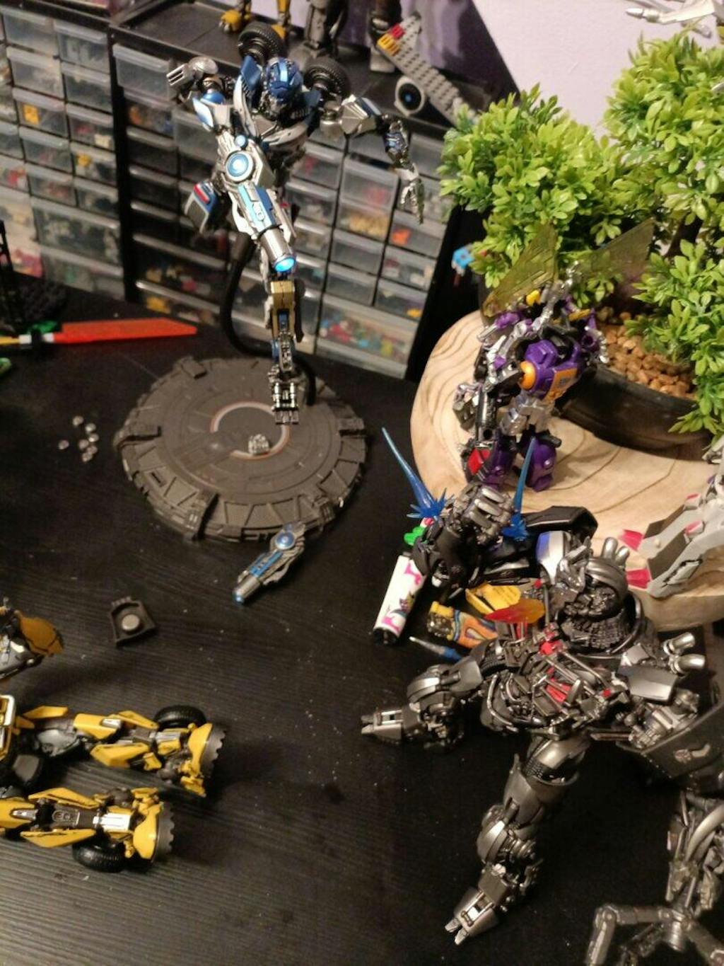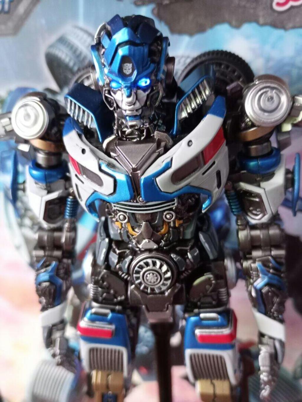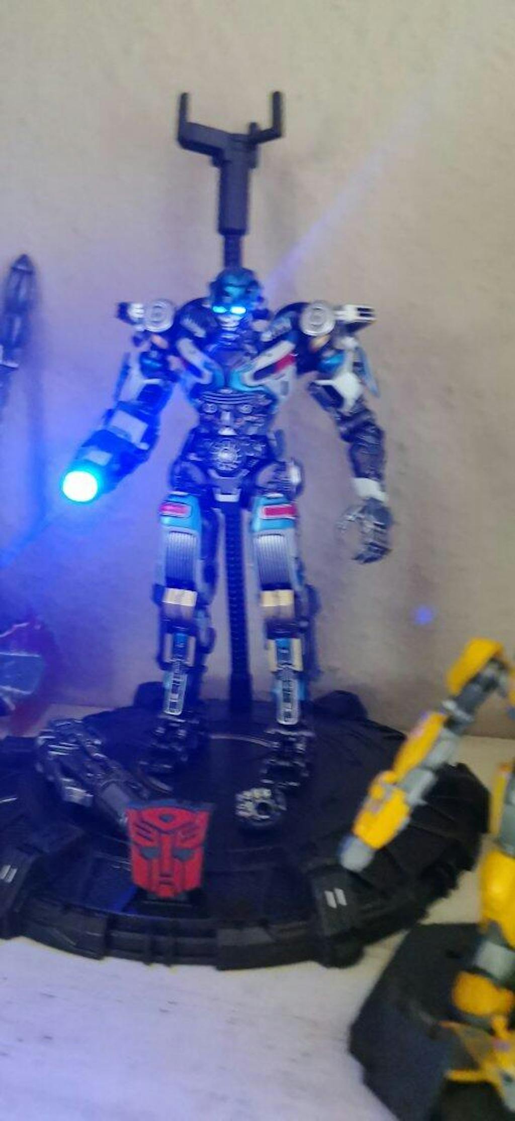 • LED Lighting Effects – The eyes and dual hand cannons feature magnetic, light-up systems for dynamic display options, powered by an Autobot logo embedded in the Energon base that acts as the light switch.